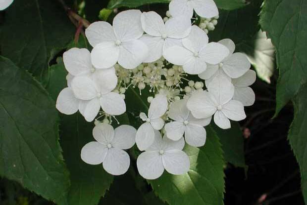 雪球绣球花长出来的叶子也是很小的,但是却是一种锯齿形状的。开出来的花颜色是玫瑰红色但是也有蓝色的花朵。我们也可以使用硫酸铝处理让绣球花开出来的花朵变成天蓝色或者是米色花心的绣球花。