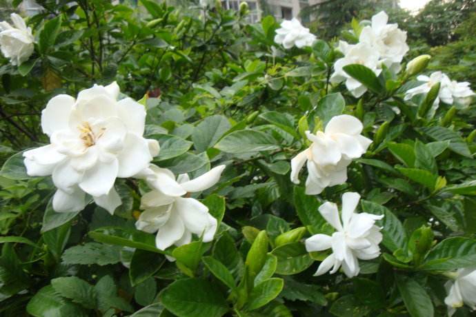 栀子花枝叶繁茂,叶色四季常绿,花芳香素雅,为重要的庭院观赏植物。栀子花在开花期,花、叶、果都挺美,人们走进其中,洁..