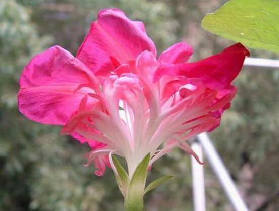 大花牵牛是草本藤生植物,花冠紫红色或粉红色,边缘常有白色的边,直径9~10cm。花期6~8月,果期7~9月。喜欢生长在湿润肥沃、排水良好的土壤生长。大花牵牛清晨开放,花大色艳,是夏秋重要的蔓性花卉,是庭院及居室的遮阴植物。