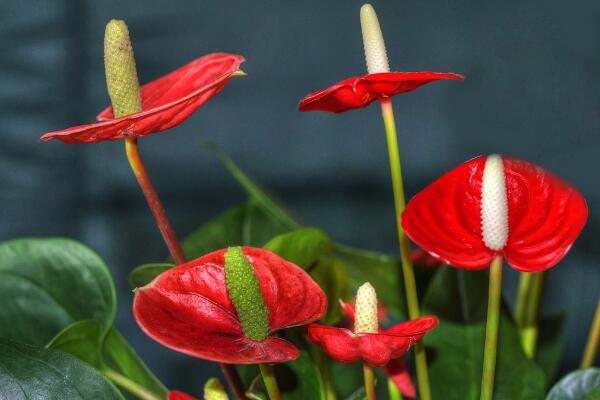 红掌花朵硕红,其颜色丰富多彩,色泽鲜艳华丽。尤其以那红艳艳的花朵最引人注目,常用来装置婚礼,新店开张,象征着人们美..